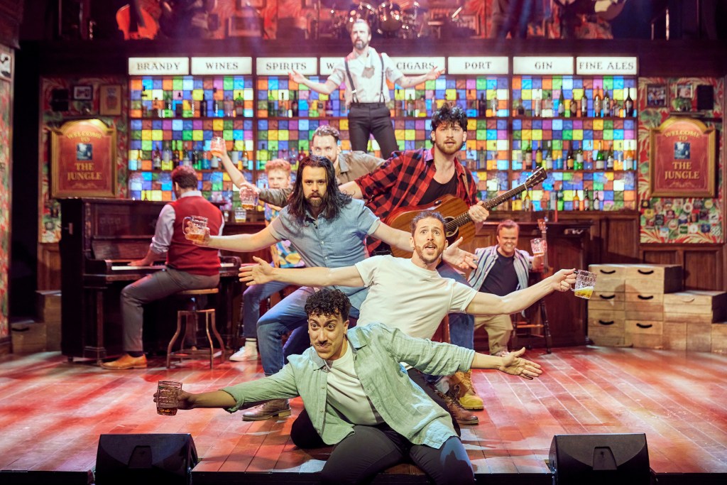 The live band above the “Jungle” pub starts playing and the cast jumps into “Welcome to the Jungle” with a burst of energy, dancing around the stage and singing their hearts out. From the first second, it is clear that the performers love what they are doing, grinning as they clink glasses with one another and sing to the audience. After the first song, the Poet (Sam Ebenezer, one of the show’s swings), introduces each of the performers. There’s Maestro (Michele Maria Benvenuto), the pianist of the group, Hardman (Adam Bayjou), the serious one who rarely smiles, Beast (Tom Miles), a guitar player with a glorious beard, Bore (Richard Lock), the operatic one, Joker (Daniel Harnett), a man constantly pranking the others and taking selfies, Handyman (Ben Goffe), a cell-phone obsessed tap dancer, Romantic (Jay Hudson, another swing), a lover, and Barman (Mark Irwin), whose nickname is quite self-explanatory in a pub.