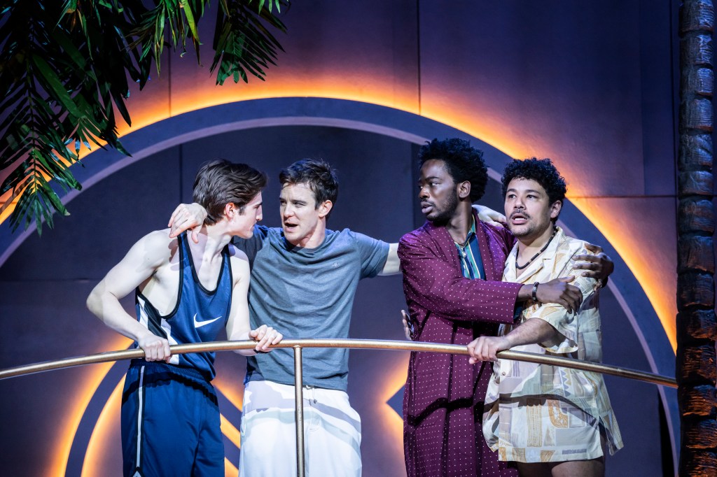 The set itself, designed by Joanna Scotcher, is its own character and the audience is truly brought into the world of Navarre through the show’s thrust-style staging. Performers are constantly moving around, entering and exiting from a range of doors around the theatre. I particularly loved the gorgeous staircase of the resort, a great set piece that makes for not only some beautiful dramatic moments but for some hilarious moments of comedy as the turntable spins around to reveal things going on around the resort.