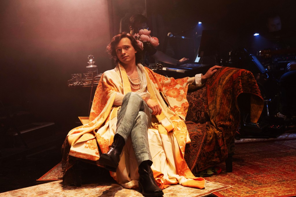 Walking into Southwark Playhouse’s The Large for Dorian: The Musical, you are greeted by a thrust stage made to look and feel like both a club and a recording studio. The set, designed by Isabella Van Braeckel, extends out into the audience, with framed photographs of members of the infamous “27 Club” – Amy Winehouse, Janis Joplin, Jimi Hendrix, Kurt Cobain, Jim Morrison and Brian Jones hanging above the seats. The band for the show, James Green, Ashley Blasse and Musical Director Aaron Clingham, are visible behind furniture and a makeshift sound booth. On the second floor of the set, records cover the walls and there is a vanity covered in flowers, quite reminiscent of something you may have found on the set of Punchdrunk’s The Burnt City.