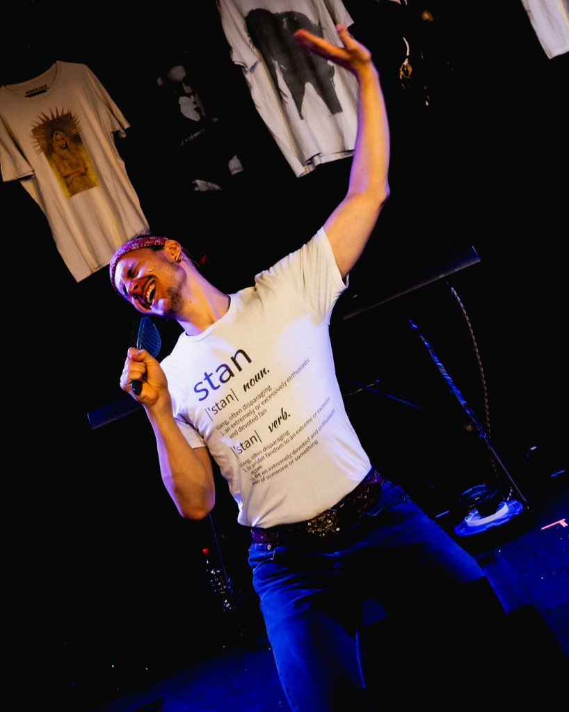 A Stan Is Born, written and performed by Alexis Sakellaris, is a musical comedy detailing Sakellaris’s move from New York City to rural Germany, where he finds his only salvation in pop divas. The show, described as “a love letter to all the divas and the gays who stan them,” has ten original songs, with Sakellaris accompanying himself on keyboard. T-shirts hang from the wall behind Sakellaris, all from different divas including Janelle Monáe, Britney Spears, Doja Cat and Lady Gaga.